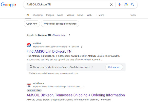 This is a recent google search for AMSOIL in Dickson TN. As you can see the Find AMSOIL in Dickson is #1 on google. This is powerful and if you are not taking advantage of this you and your retail accounts are missing out on opportunity.